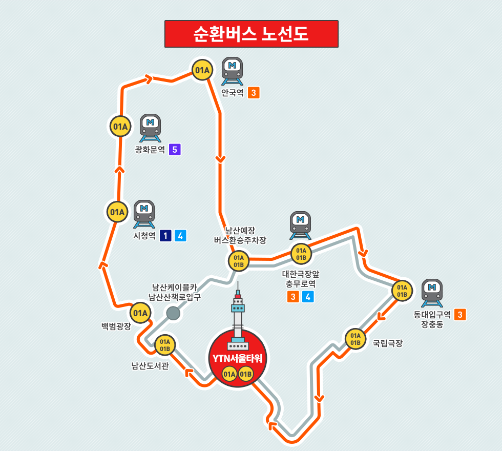 - 가을 (9-11월): 단풍 시즌에는 01A번 버스를 이용해 남산의 단풍을 감상하세요