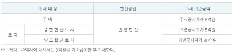 현재 종합부동산세는 주택의 경우, 1세대 1주택자는 공시가격 12억 원 초과, 다주택자는 9억 원 초과 시 과세됩니다. 토지의 경우 종합합산토지는 5억 원 초과, 별도합산토지는 80억 원 초과 시 과세 대상이 됩니다.